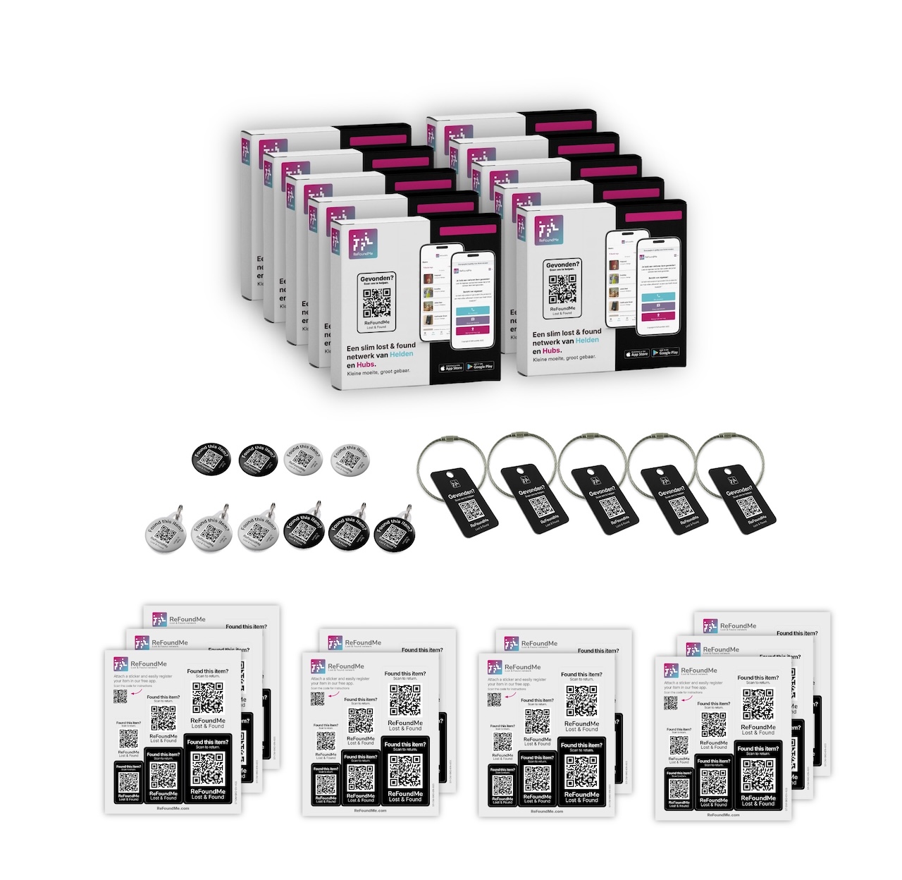 | Inhoud pakket | 10 ReFoundMe StartPacks 5 bagagelabels 10 MiniTags 60 stickers: 18 stickers maat L, 18 stickers maat M, 18 stickers maat S |